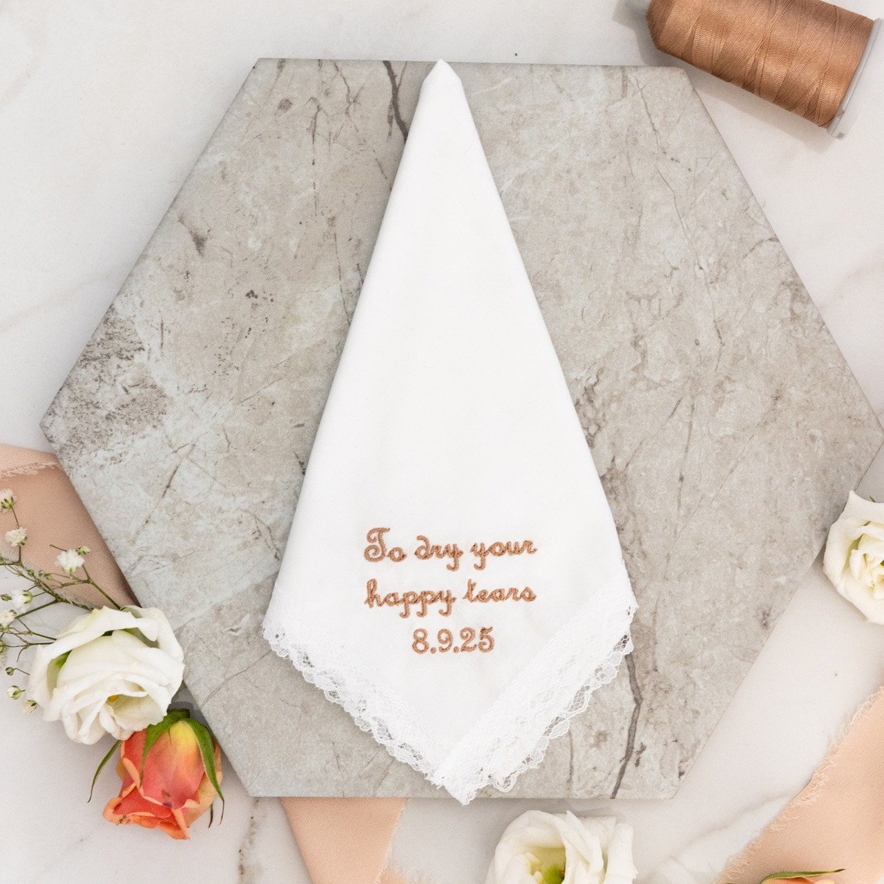 And this style is not just for weddings! Our “To dry your happy tears” message has been embroidered on handkerchiefs for beauty pageants, baptisms, the birth of babies, adoptions, welcome homes, retirements, milestone birthdays & anniversaries and numerous other special happy occasions.
