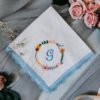 This happy tear handkerchief is cut from 100% white cotton, sewn with white lace, then embroidered with your personalized happy tear message in the color of your choice and a sweet little heart.