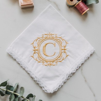 This Dainty White handkerchief style is cut from white fabric and trimmed in white lace. It is monogrammed with an initial in our Royal design. Choose your color for the initial.