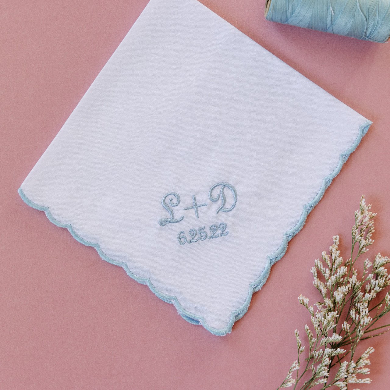 Scalloped powder blue edge white handkerchief style is embroidered with the couple’s initials and wedding date. A perfect little favor from the big day. Customized with the thread color of your choosing.